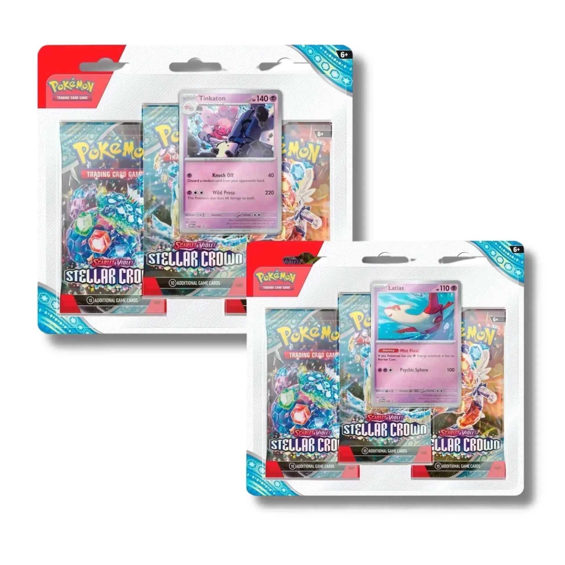 Le Tripack Écarlate et Violet : Couronne Stellaire est parfait pour les collectionneurs et les joueurs souhaitant obtenir des cartes exclusives tout en enrichissant leur collection. Chaque tripack est disponible en deux visuels :